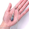 This stunning necklace showcases a vibrant rainbow fluorite gemstone, celebrated for its natural bands of purple, green, and blue. The fluorite measures approximately 3.5 cm in length and 1.5 cm in width, and is skillfully set in a .925 sterling silver bezel, enhancing the gem’s natural brilliance and depth.