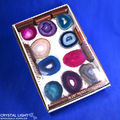 A large variety is presented in the box each agate slice ranges from 80mm x 70mm to 90mm x 40mm approx including the stand.