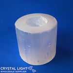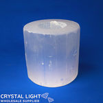 Selenite carved into a cylinder with a cavity to hold a Tealight Candle. The outside is rough while the top is polished. These candle holders have rough sides and a polished top.
